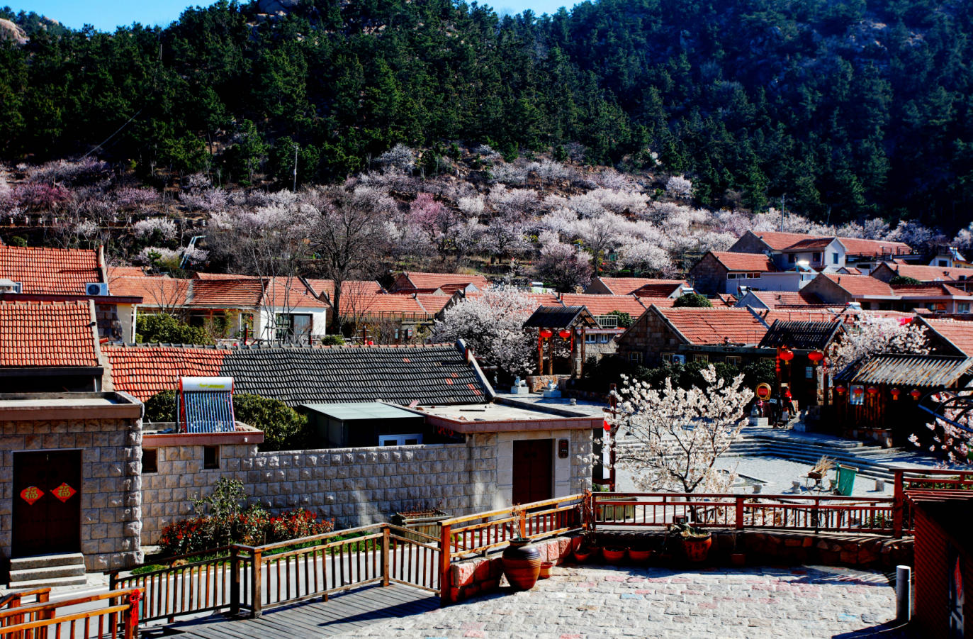 在山东省青岛市崂山区沙子口街道东麦窑村,樱花盛开,红瓦映春,尽显宜居宜游的和美气象。