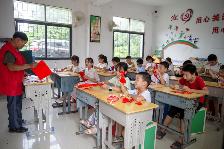 7月23日,咸宁市咸安区汀泗桥镇洪口村“四点半学校”的孩子们在老师的指导下学习剪纸。新华网 钟奕 摄
