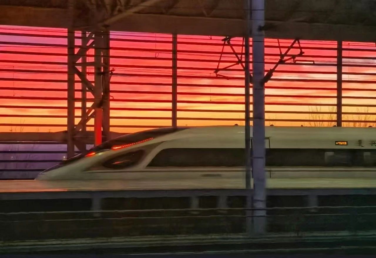 天津南站,一列复兴号高铁划破黎明,在朝霞的掩映下开启新的一天。